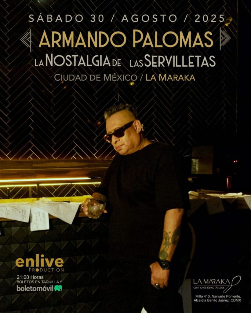 Armando Palomas, el entrañable personaje y artista importante del rock mexicano, regresará a los escenarios de la capital del país el próximo sábado 30 de agosto de 2025, en punto de las 21:00 horas, con una presentación especial en el Salón La Maraka de la Ciudad de México. Este concierto, organizado por la promotora EnLive, marcará el inicio de una serie de siete presentaciones exclusivas en diferentes ciudades del país, concebidas como un regreso atípico muy a su manera y en su propio ritmo, dado que, por razones personales y de salud, ha decidido no emprender más giras largas como en años anteriores. La cita en La Maraka no solo representa una oportunidad de reencontrarse con su público capitalino, sino también el estreno en vivo de su más reciente y esperado proyecto: El disco-libro «La Nostalgia de Las Servilletas». Boletos a la venta en el Sistema Boletomovil y en taquillas del inmueble.