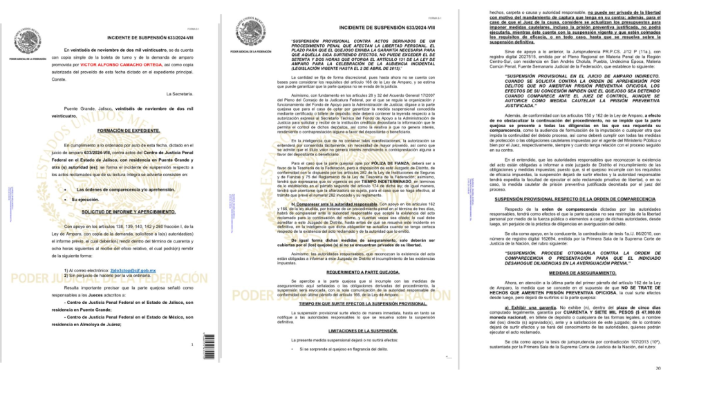 La juez II de distrito en materia penal con residencia en Jalisco Guadalupe Baca Valencia concedió la suspensión provisional de amparo al empresario Víctor Alfonso Camacho Ortega contra citatorios de comparecencia u órdenes de aprehensión que solicite la Fiscalía General de la República (FGR) en su contra a jueces del Centro de Justicia Penal Federal de Puente Grande en esta entidad, y del Centro de Justicia Penal Federal en el Estado de México con residencia en Almoloya de Juárez, y de la Ciudad de México, además de una garantía por 47 mil pesos.