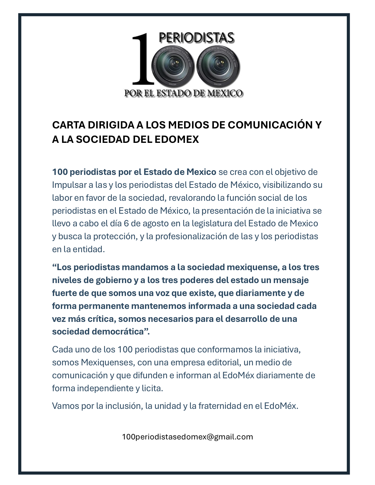 100 periodistas por el Estado de Mexico se crea con el objetivo de Impulsar a las y los periodistas del Estado de México, visibilizando su labor en favor de la sociedad, revalorando la función social de los periodistas en el Estado de México, la presentación de la iniciativa se llevo a cabo el día 6 de agosto en la legislatura del Estado de Mexico y busca la protección, y la profesionalización de las y los periodistas en la entidad.