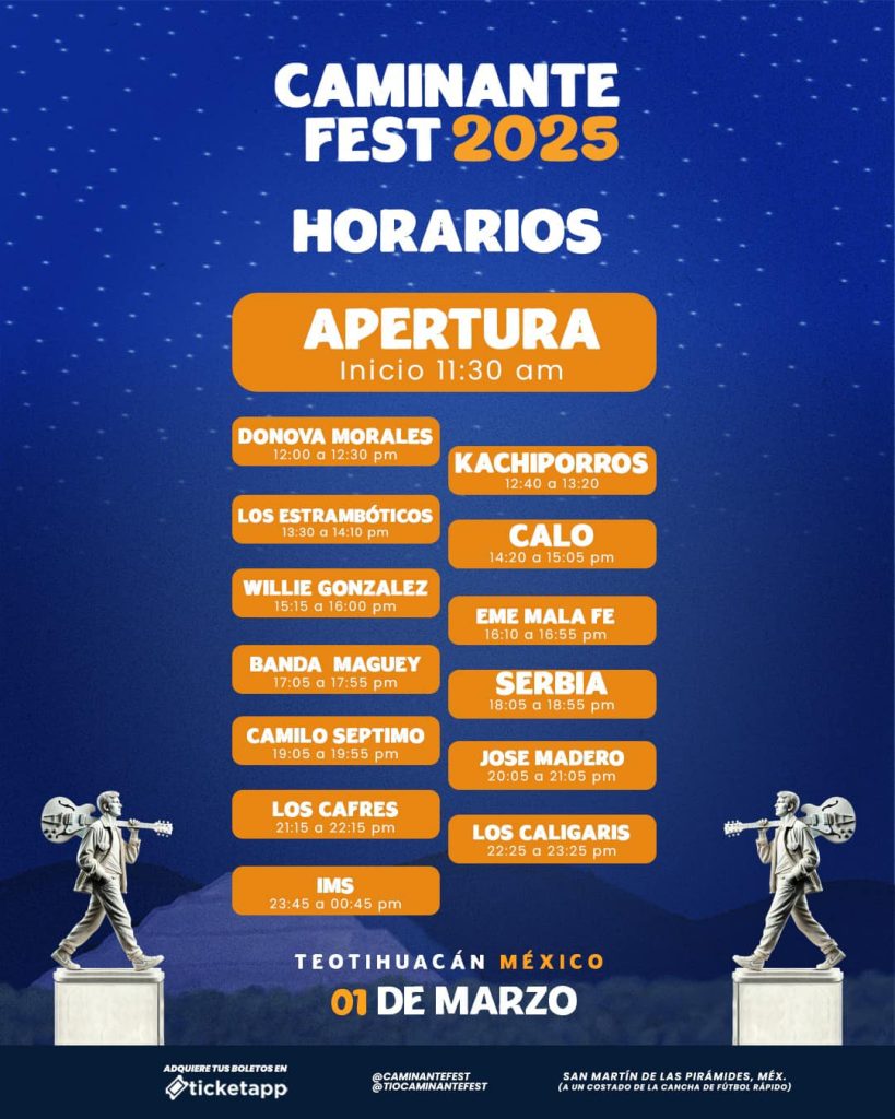 El Festival Caminante 2025, uno de los eventos musicales más esperados del próximo año, ha sorprendido a sus seguidores al anunciar un line up de ensueño con algunas de las agrupaciones que por separado, han logrado convertir en sold out conciertos en la capital mexicana, lo que hace de este elenco uno de los más impresionantes de su historia. Este espectáculo se llevará a cabo el sábado 1 de marzo de 2025, en el mágico y ancestral entorno de las Pirámides de Teotihuacán, un lugar que no solo es patrimonio cultural de México, sino también un punto de encuentro de historia y modernidad. Los boletos ya están disponibles a través del sistema Ticketapp en https://lc.cx/TOugP7 y en puntos de venta autorizados, garantizando el acceso a una jornada que promete ser inolvidable.