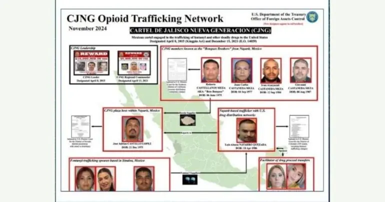 «Las personas designadas en esta red también participan en el tráfico de personas para promover sus actividades de tráfico de drogas. Además, como miembros del CJNG, algunas de las personas sancionadas hoy desempeñaron un papel destacado en las primeras etapas de la crisis de opioides en Estados Unidos», dice el comunicado.