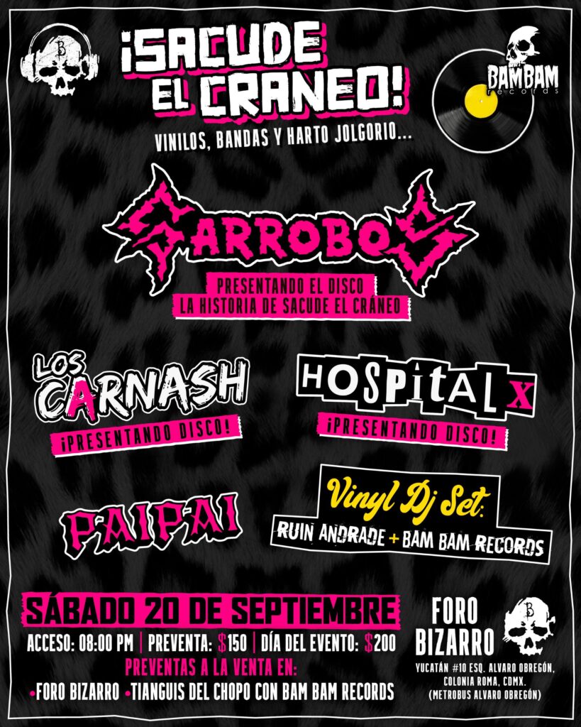 La segunda fecha, el sábado 20 de septiembre, será en el Foro Bizarro, en Yucatán No. 10, esquina Álvaro Obregón, colonia Roma, justo a un costado del Metrobús Álvaro Obregón. Allí, con el mismo precio de preventa de $150.00, la noche se expandirá en un cartel múltiple y explosivo: además de Garrobos, que interpretará un repertorio distinto al de la primera fecha, estarán Los Carnash, presentando también nuevo disco; Hospital X, igualmente con estreno discográfico; la energía de Pai Pai; y un DJ set con viniles a cargo de Ruin Andrade y Bambam Records, hilando la noche con joyas de colección.