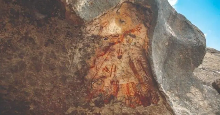 «La mano formaba parte de un panel con pintura rupestre (de 5 metros de ancho, 3 metros de altura y 1.5 metros de profundidad), donde hay más de 150 figuras pintadas en las paredes, en colores rojo, amarillo, blanco, negro y naranja», indicó el boletín.