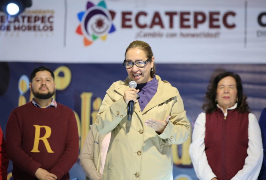 La alcaldesa acudió a la explanada municipal a convivir con los menores que asistieron al Festival Ecatepeques, organizado por su gobierno; ahí compartió una rosca de reyes monumental para celebrar la llegada de Melchor, Gaspar y Baltazar a territorio ecatepense.