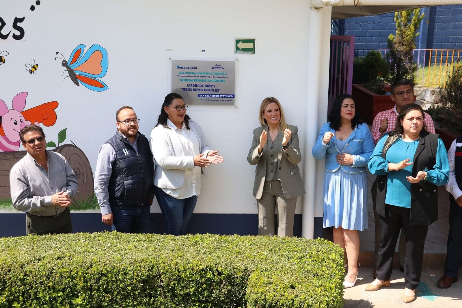 · La presidenta municipal, Romina Contreras, regresó al Jardín de Niños “Jesús Reyes Heroles”, de San Francisco Ayotuxco, para entregar los trabajos complementarios de rehabilitación de este plantel y llevar herramientas escolares a los estudiantes
