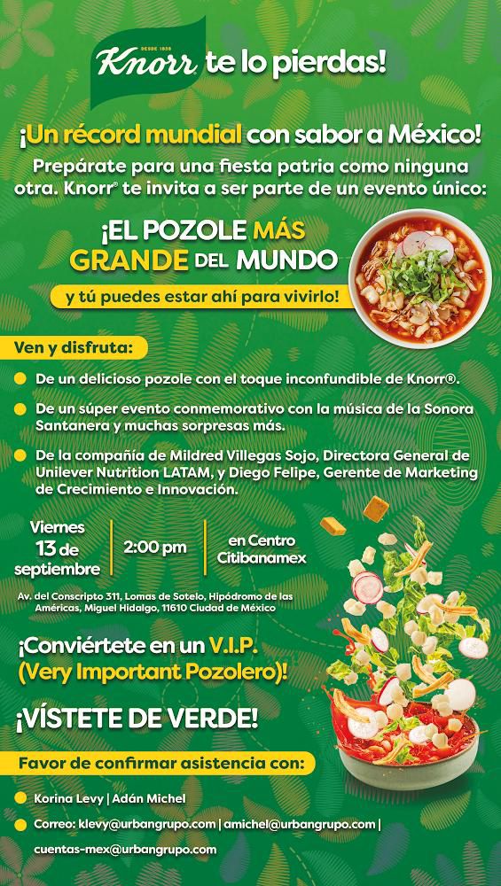 En el marco de las fiestas patrias, Knorr® busca romper el Récord Guinness del pozole más grande del mundo, al preparar 1,850 litros de este plato típico y manifestación cultural viva que conecta a todas las latitudes del país, reconocido además por la UNESCO como Patrimonio Cultural Inmaterial de la Humanidad.