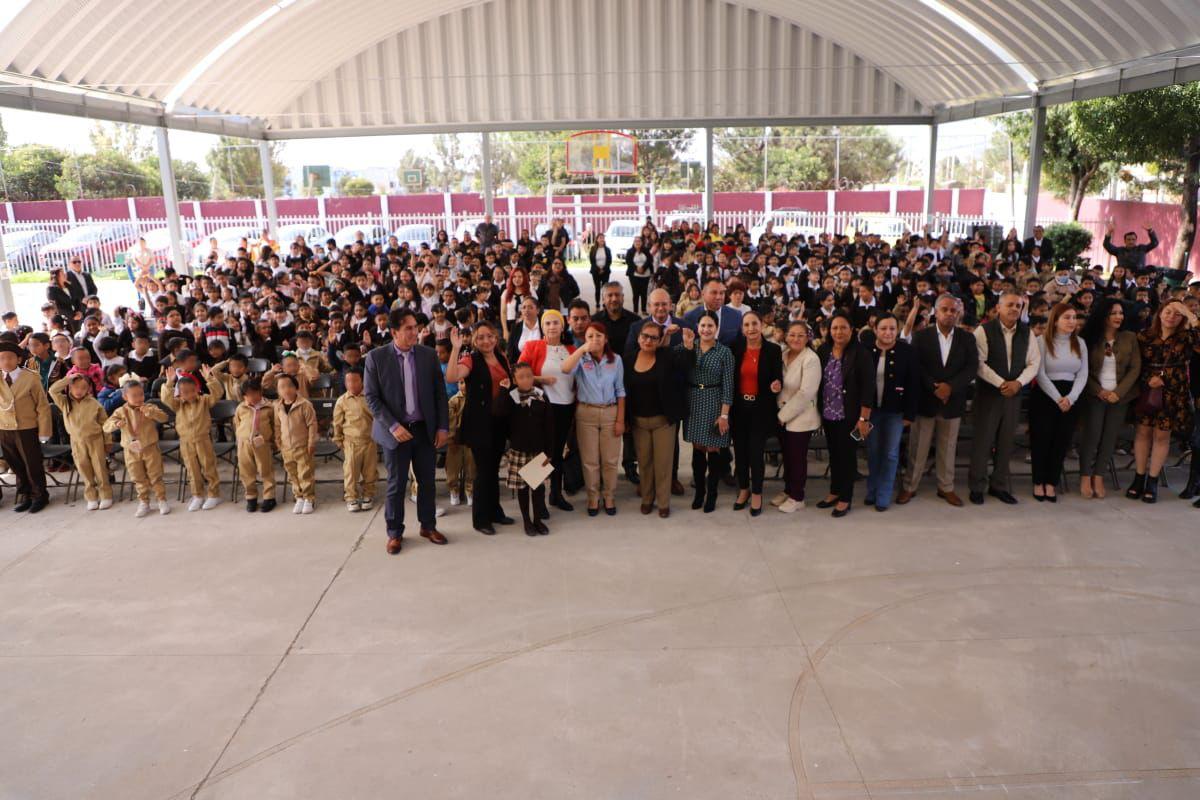 Al entregar el arcotecho de la Escuela Primaria Federal Joaquín Fernández de Lizardi, en Urbi Villa del Campo, refrendó el compromiso de trabajar todos los días para alcanzar las metas y hacer realidad los anhelos de muchos niños y jóvenes, para que tengan instalaciones dignas que permitan su máximo desarrollo.
