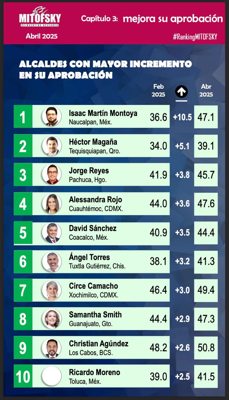 De acuerdo a este ranking bimestral de Mitofsky, de los alcaldes del país que mejoraron su aprobación, el presidente municipal de Naucalpan se colocó a la cabeza. Esta encuesta bimestral ciudadana fue levantada para un medio nacional (El Economista), en la que se consideró a 150 presidentas y presidentes municipales a nivel nacional.