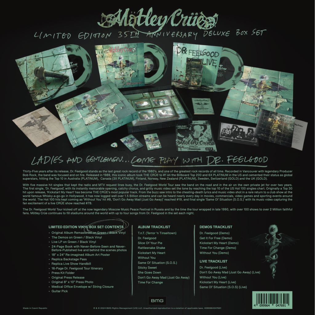 Treinta y cinco años después de su lanzamiento, Dr. Feelgood se erige como el último gran disco de rock de la década de 1980, y uno de los mejores discos de rock de todos los tiempos. Grabado en Vancouver con el productor Bob Rock y publicado en 1989, este álbum icónico llevó a MÖTLEY CRÜE al número 1 del Billboard Top 200 y obtuvo una certificación 6X PLATINO en los EE.UU.. El álbum consolidó el estatus de la banda como superestrella mundial, alcanzando el Top 10 en Australia (PLATINO), Canadá (3 veces PLATINO), Finlandia, Noruega, Nueva Zelanda (PLATINO), Suecia, Suiza (ORO) y el Reino Unido (ORO).