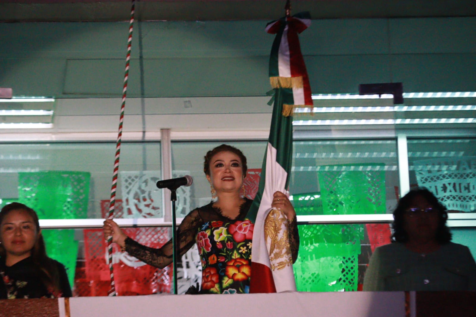 La ceremonia fue encabezada por la Presidenta Municipal, Yoselin Mendoza, quien, con emoción y respeto por nuestra historia, pronunció la tradicional arenga en honor a los héroes que nos dieron libertad: