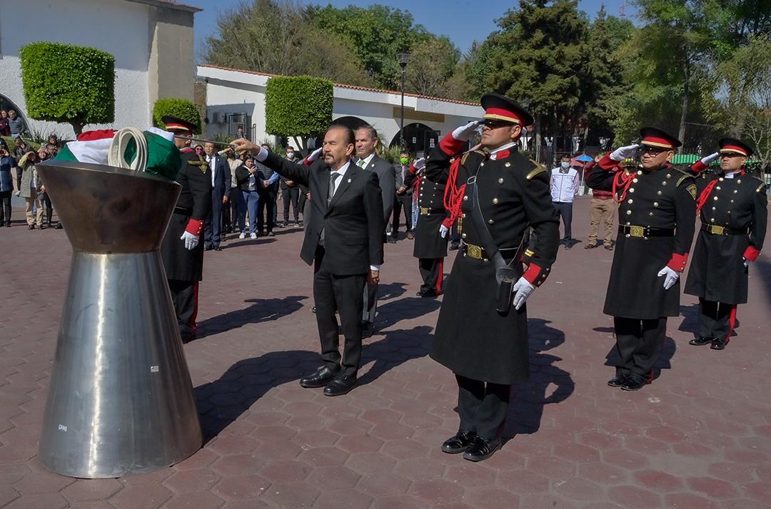 En un acto solemne lleno de identidad y orgullo nacional, el presidente de Atizapán de Zaragoza, Pedro Rodríguez Villegas, encabezó el izamiento de la Bandera Mexicana que este año ondeará en la Explanada Municipal, además de incinerar el lábaro patrio que durante el 2025 engalanó este espacio público.