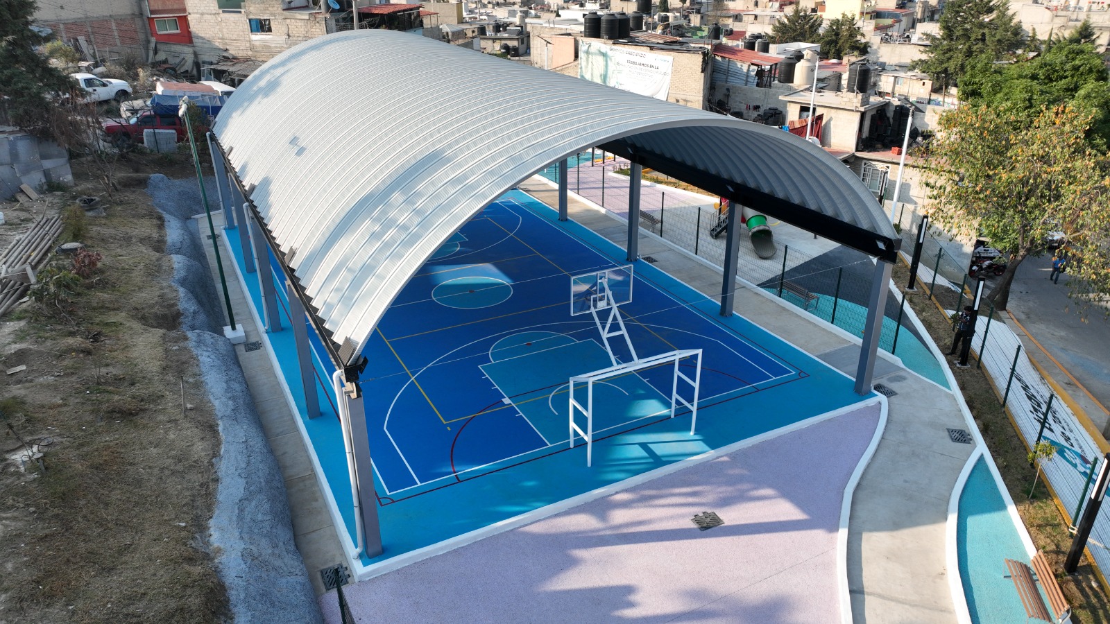 Este multideportivo se construyó en un área de 1,263.20 metros cuadrados y consta de un arcotecho, una cancha con firme de concreto, piso permeable en área de juegos y gimnasios, rejacero perimetral, iluminación, gimnasio al aire libre y juegos infantiles, bancas y pórtico de acceso